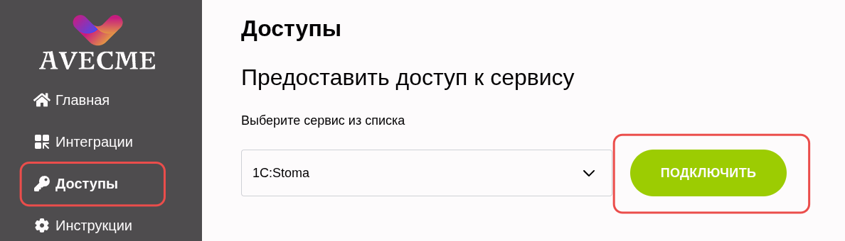 Зайдите в личном кабинете Avecme в раздел "Доступы". Выберите в списке доступов "1C:Stoma" и нажмите "Подключить"